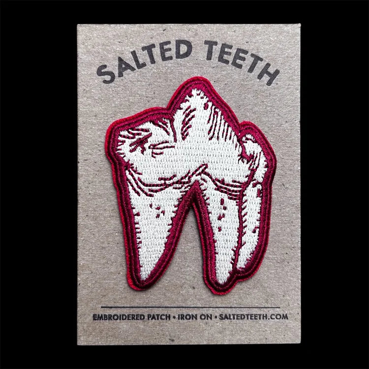 Embroidered fox tooth patch. Measures 2.5” x 2”. Iron on backing. Comes packaged with a printed backing card in a protective sleeve.