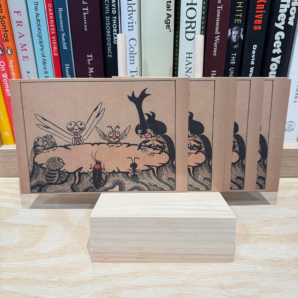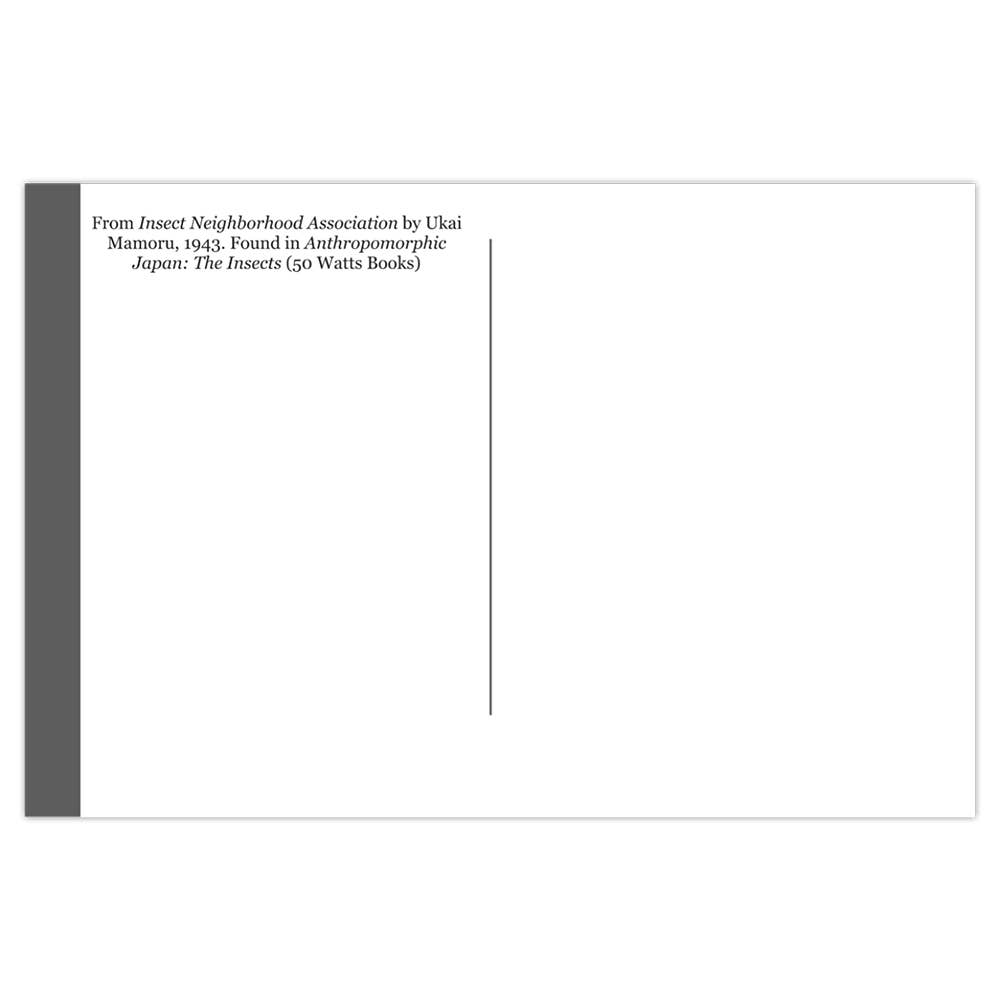 A gloss-laminate postcard, 4 x 6 inches. Features an illustration from Insect Neighborhood Association by Mamoru Ukai (1943 Japan), from the 50 Watts collection. This is image is also found in our book Anthropomorphic Japan: The Insects.